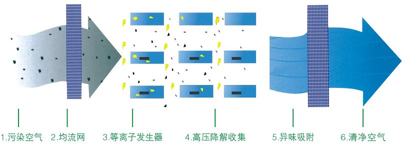 采用低溫等離子體分解油霧、廢氣等污染介質時,等離子體中的高能離子起決定性的作用。流星雨狀的高能離子與介質內分子(原理)發生非彈性碰撞,將能量轉化成基態分子(原子)的內能,發生激發、離解、電離等一系列過程使污染介質處于活化狀態。污染介質在等離子體的作用下,產生活性自由基,活化后的污染物分子經過等離子體定向鏈化學反應后被脫除。當離子平均能量超過污染介質中化學鍵結合能時,分子鏈斷裂,污染介質分解,并在等離子發生器吸附場的作用下被收集。在低溫等離子體中,可能發生各類型的化學反應,這主要取決于等離子的平均能量、離子密度、氣體溫度、污染物介質內分子濃度及共存的介質成分。