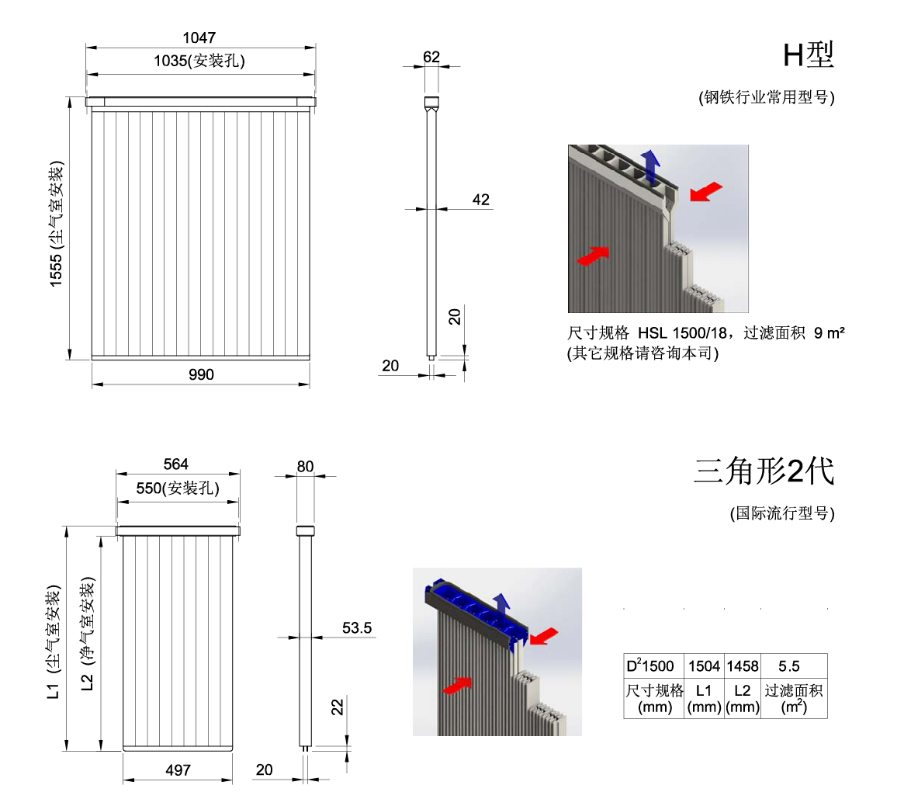 11.方便安裝,緊湊的形體,占地面積小,只有布袋體積的1/2~1/3,但仍適應高入口濃度;塑燒板除塵器過濾面的波紋形設計,使其在同體積內的過濾面積是濾袋的3~6倍,同過濾面積時所占空間僅是布袋除塵器的1/3~1/6,并且可以疊加設計縮小占地面積。